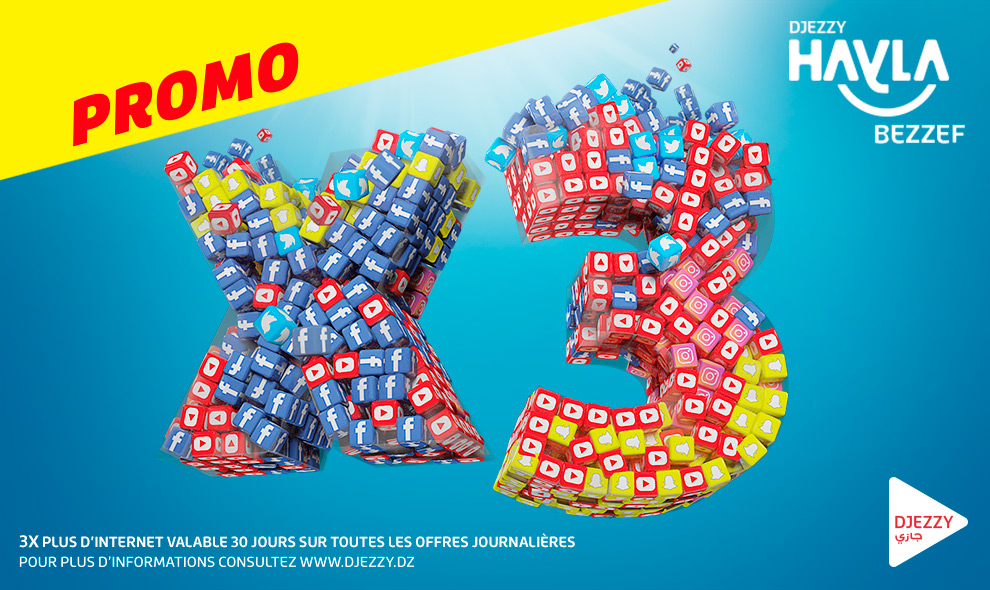 Toujours plus proche de ses clients, Djezzy revient avec une nouvelle promotion HAYLA BEZZEF en direction des petits budgets en leur offrant le triple du volume internet et cela pendant un mois.