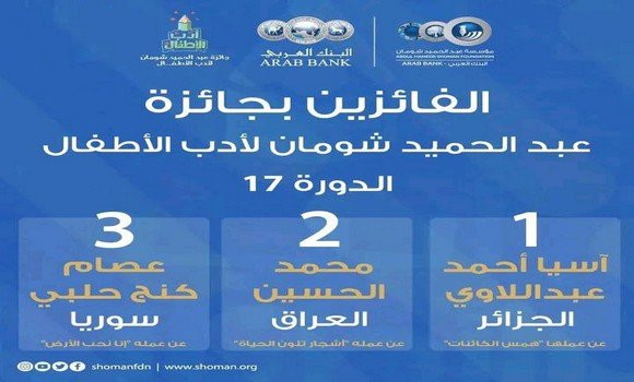 Dans un communiqué rendu public, mardi, sur son site Web, la fondation « Abdul Hameed Shoman », basée en Jordanie, a dévoilé les noms des trois lauréats de son Prix de littérature pour enfants de l’édition 2023 qui a vu la participation de 492 créateurs issus de 17 pays arabes et étrangers, dans le domaine de « la poésie sur le thème de l’environnement destinée aux enfants âgés de 9 à 12 ans ».