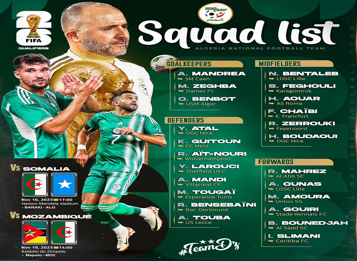 Le sélectionneur de l’équipe nationale de football, Djamel Belmadi, a annoncé ce vendredi la liste des 23 joueurs concernés par les matchs contre la Somalie et le Mozambique, dans le cadre des première et deuxième journées du Groupe 7 des qualifications pour la Coupe du Monde 2026.