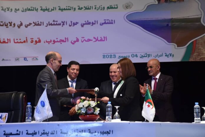 La convention a été signée par la directrice de la programmation et de l’appui économique au ministère, Mme Souad Assaous, et le délégué général de l’Association, M. Rachid Belaid, en présence du ministre de l’Agriculture et du Développement rural, Youcef Cherfa, et ce, en marge la rencontre nationale sur l’investissement agricole, organisée sous le thème « l’agriculture au sud, un atout majeure pour notre sécurité alimentaire », sous le haut patronage du président de la République, M. Abdelmadjid Tebboune.