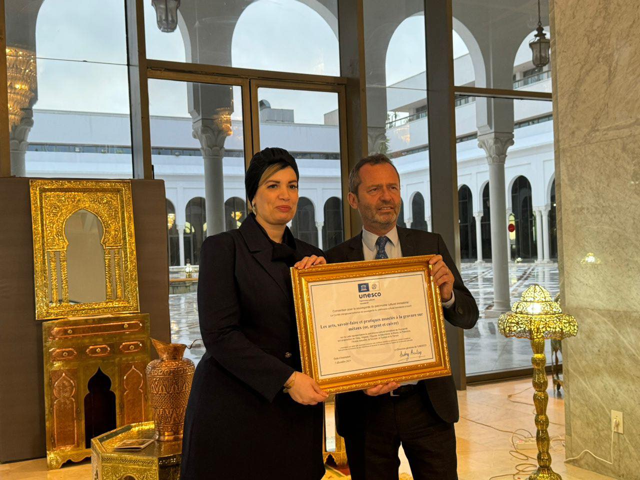 La ministre de la Culture et des Arts, Soraya Mouloudji, a reçu, lundi à Alger, l’attestation d’inscription de « la gravure sur métal: or, argent et cuivre, savoir-faire, arts et pratiques » sur la liste du patrimoine mondial immatériel de l’humanité de l’Unesco qui lui a été remise par le directeur du bureau régional de l’Unesco, Eric Falt.