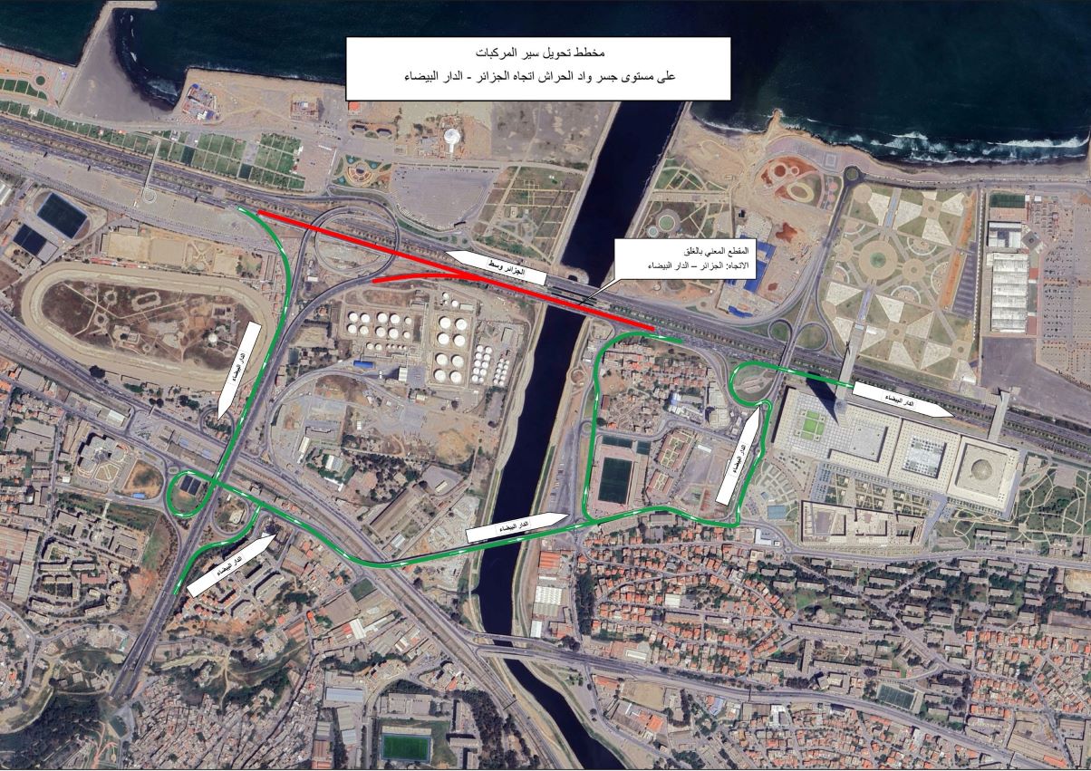 Pendant cette période, la circulation sera déviée via plusieurs itinéraires. Les automobilistes devront suivre les indications vers l’échangeur de « Oued Ouchaïeh », puis l’échangeur « Rue de Tripoli » (Route Nationale n°08) avant le tunnel. Ils passeront ensuite par le pont reliant la « Rue de Tripoli » à la « Grande Mosquée d’Alger », pour rejoindre l’autoroute Est via l’échangeur de la Grande Mosquée.