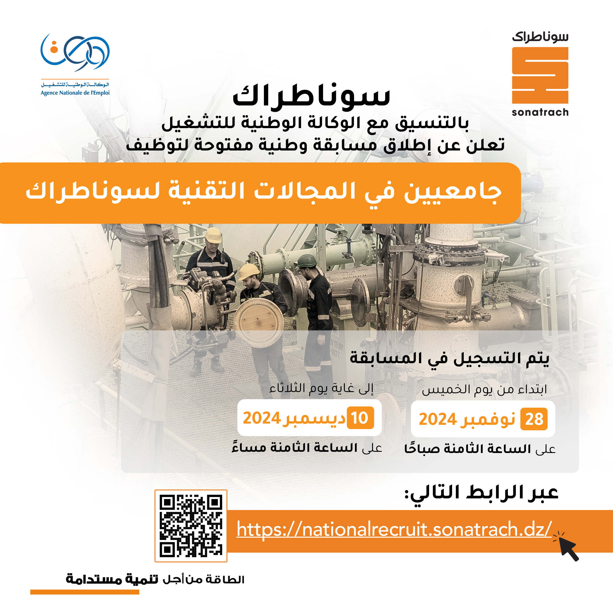 Les inscriptions au concours national seront ouvertes aux demandeurs d’emploi via le site internet dédié à cet effet (accessible par le lien: https://nationalrecruit.sonatrach.dz/) et ce, à compter du jeudi prochain à 08h00, jusqu’au mardi 10 décembre prochain à 20h00, selon la même source.