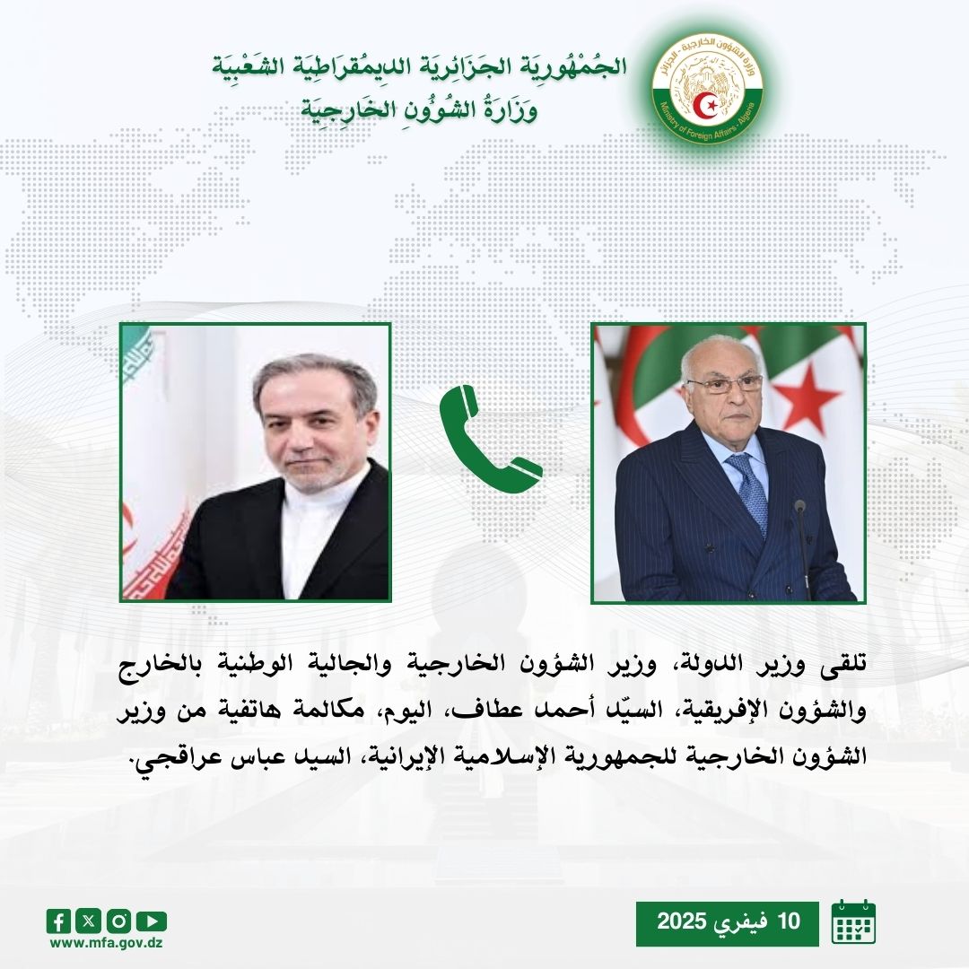 Le ministre d’Etat, ministre des Affaires étrangères, de la Communauté nationale à l’étranger et des Affaires africaines, M. Ahmed Attaf, a reçu, lundi, un appel téléphonique du ministre des Affaires étrangères de la République islamique d’Iran, M. Abbas Araghchi, indique un communiqué du ministère.