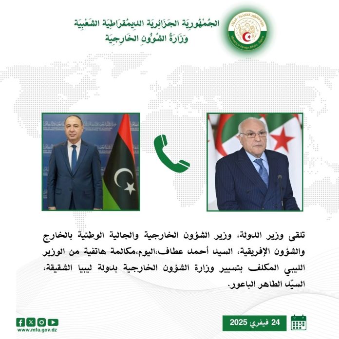 M. Attaf a reçu un appel téléphonique du ministre chargé de la gestion du ministère des Affaires étrangères de l’Etat de Libye, M. Taher Al-Baour. Cet appel s’inscrit dans le cadre « des traditions de concertations et de coordination entre les deux pays frères, notamment en ce qui concerne les dossiers politiques majeurs sur la table de l’Assemblée générale et du Conseil de sécurité onusiens », indique un communiqué du ministère.