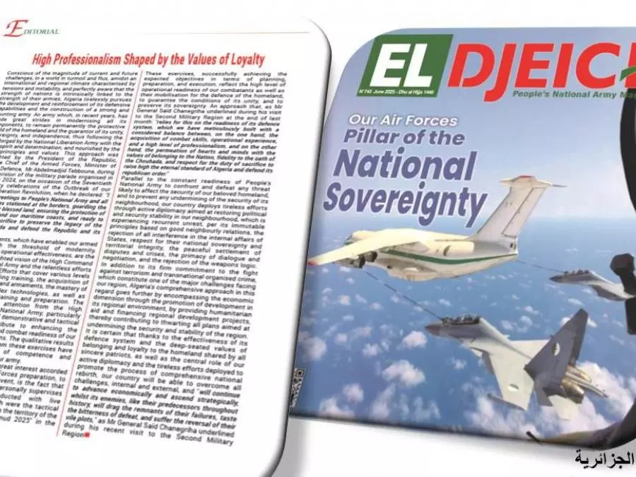 La revue mentionne dans son éditorial intitulé « Haut niveau de professionnalisme façonné par les valeurs d’abnégation », qu’« il est certain que grâce à l’efficacité de son système de défense et à l’imprégnation de tous les patriotes sincères des valeurs d’appartenance à la Patrie et de loyauté envers elle, ainsi qu’au rôle central de notre diplomatie active et aux efforts inlassables déployés pour promouvoir le processus de renaissance nationale globale, notre pays sera en mesure de relever tous les défis, internes et externes ».
