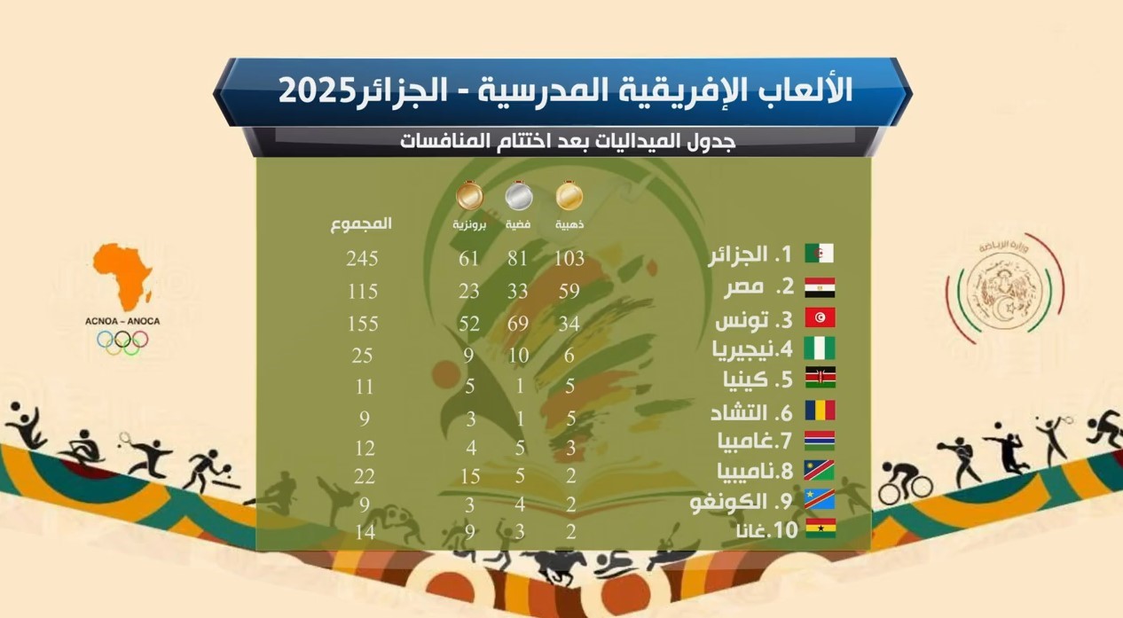 L’Algérie a terminé les Jeux, en première position, devançant l’Egypte avec 115 médailles (59 or, 33 argent, 23 bronze) et de la Tunisie avec un total de 155 médailles (34 or,69 argent, 52 bronze), selon le tableau final publié par le comité organisateur.