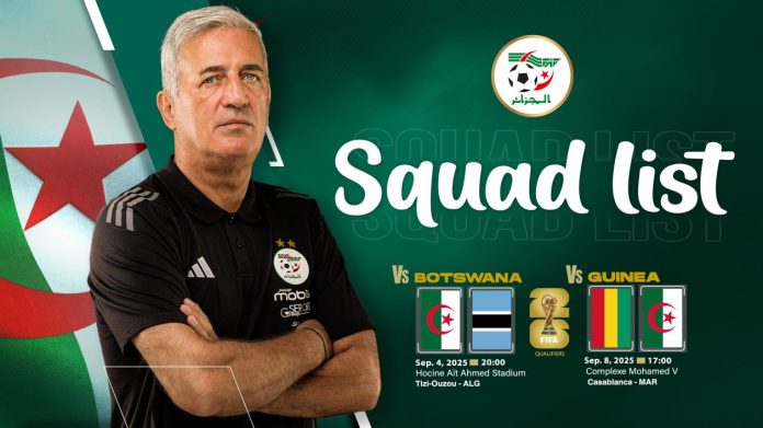 La liste a été annoncée lors d’une conférence de presse tenue à la salle « Mohamed Sellah » du stade Nelson-Mandela de Baraki. Elle est marquée par la convocation d’Ilan Kais Kebbal (Paris FC/ France), qui rejoint pour la première fois le groupe. En revanche, Petkovic doit composer sans Mohamed Farsi (Colombus Crew/ Etats-Unis), Mohamed Amine Madani (JS Kabylie) et Himad Abdelli (Angers/ France), blessés. Ismaël Bennacer, sans club depuis son départ de l’AC Milan, n’a pas été retenu.