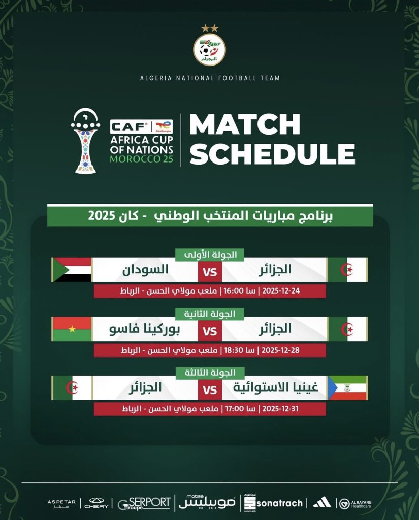 Logée dans le groupe E aux côtés du Burkina Faso, de la Guinée équatoriale et du Soudan, l’Algérie débutera la compétition le 24 décembre face au Soudan. La rencontre aura lieu au stade Moulay Hassan de Rabat à 16h00.